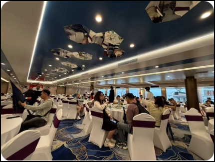 20 点 30 分的游船说明会上,船长特意介绍了船顶的 1500 平方米光伏板,透过舷窗望去,光伏板在夕阳下泛着微光,让人真切感受到 "绿色航行" 的意义。