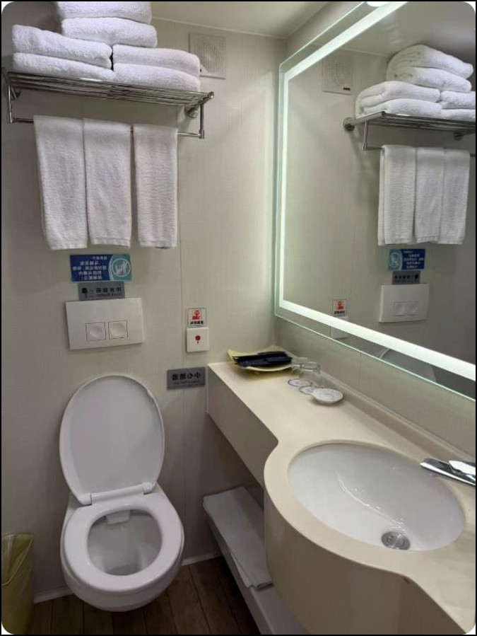 拿到房卡后乘电梯到三楼,房间干净整洁,灯光柔和,每个房间都带独立的阳台,有椅子和小桌,卫生间配备一次性洗漱用品,热水充足。