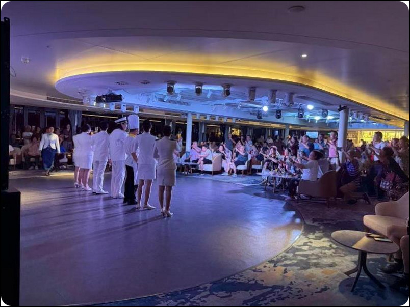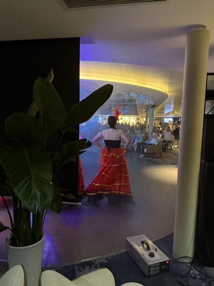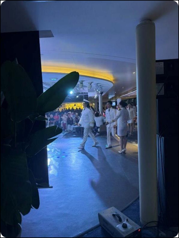 星际阿波罗号游轮的整体服务也特别好,下船和上船时都会叮嘱大家小心脚下,游览完景点回船还备了热毛巾擦手,第二天晚上船上举行了船长见面会和文艺表演,第三天晚上也安排了游客才艺表演,让每个晚上都有娱乐项目。因为到6楼会场的时间晚,只拍到舞台后面。