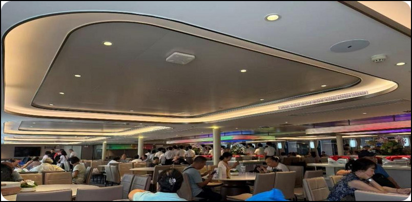 星际阿波罗的餐食也安排的很好,每日正餐菜品丰富不重复菜单,自助取餐,按楼层广播通知就餐,餐盘杯子都高温消毒处理,这次在2楼大餐厅用餐稍微有一点拥挤,但还是很有秩序。