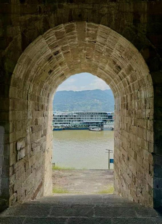 从奉节老码头的门洞里拍到停靠在宝塔坪旅游码头的阿波罗号,古今交汇在镜头前。