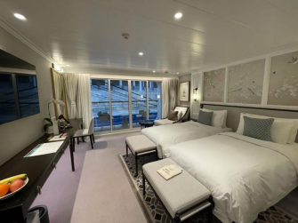 长江探索以全套房著称,31平的豪华套房也带有宽敞的露台,视野无敌;整个房间宽敞舒适,灯光明亮,还配备有戴森吹风机、智能马桶、空气净化器,沐浴用品的香型也很高级。