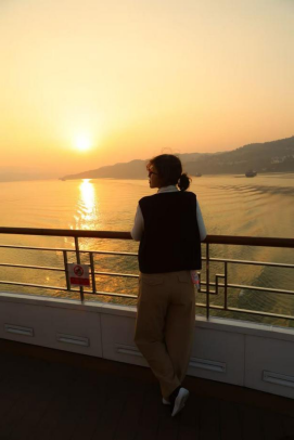 长江探索的游览线路可谓经典。船上游览当然是顺流而下,经过白帝城、夔门,阅尽瞿塘峡之险,巫峡之秀,体验三峡大坝升船机的壮观奇妙,一路都有船上的吴老师双语讲解,让我们沉浸在自然景观与人文历史交织的美妙之中。