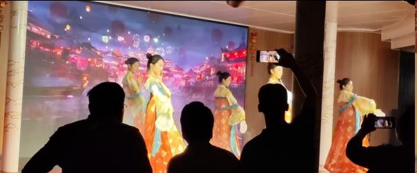 最令人激动的一刻,船长走到我们母女面前,举起酒杯和我们干杯,为我们祝福。我们很幸运,船长和我们干杯,永远给我们留下难忘记忆,三峡游轮的船长真是平易近人。 核心团队个个多面手——记华夏之夜歌舞晚会 第三天晚上,夜幕降临,一场华夏之夜歌舞晚会在华夏5号礼堂拉开帷幕,舞台灯光与海面波光粼粼交相辉映,游客们纷纷涌入礼堂,个个脸上洋溢着灿烂的笑容。 歌舞晚会场面热闹非凡,舞台上灯光闪烁,就像夜空中最璀灿的星星。全场节目都表演得很精彩,都是航程核心团队工作人员,他们个个都是多面手。