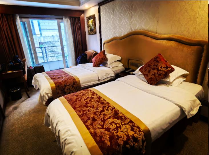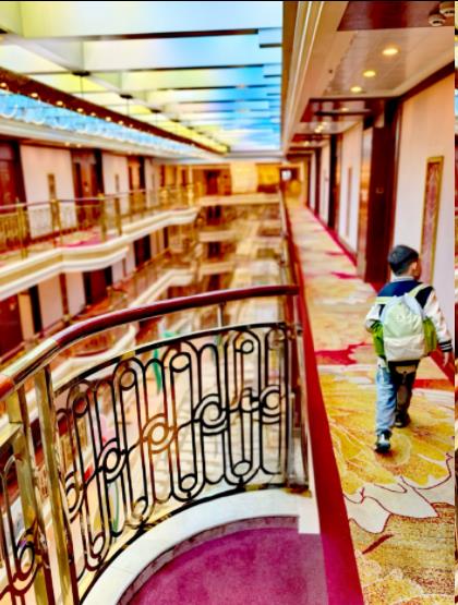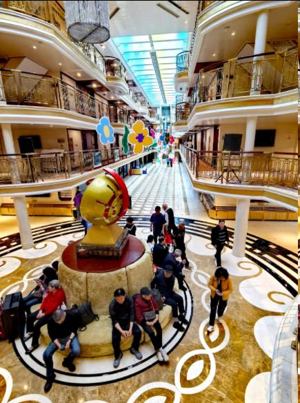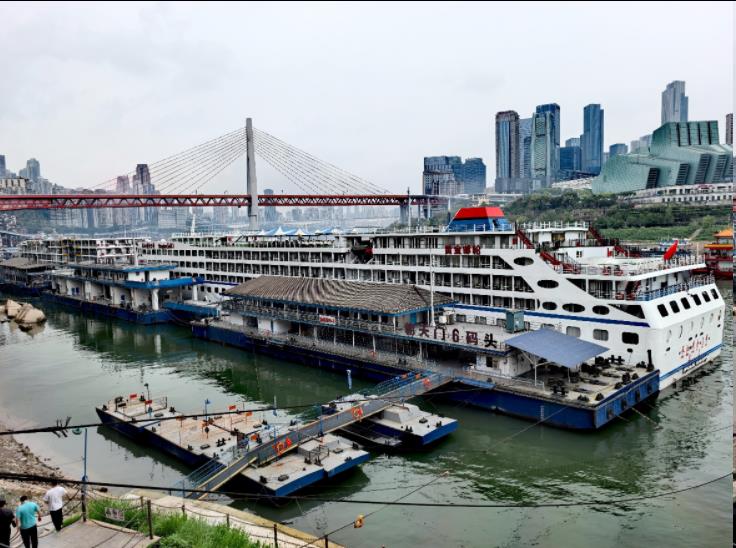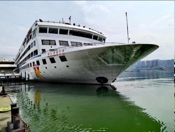 4月6日傍晚,我们抵达重庆朝天门6号码头,远远便望见黄金3号游轮静立江畔,如一座漂浮在江面上的五星级宫殿。游轮总长149.95米,宽24米,排水量达17000吨,6层甲板错落有致,现代与简欧交融的装修风格,尽显高端游轮的雅致质感。登船入口处,黄金3号的工作人员整齐列队,笑容温暖真诚,每一个手势、每一句问候都透着专业与热情,让我们瞬间卸下旅途疲惫。