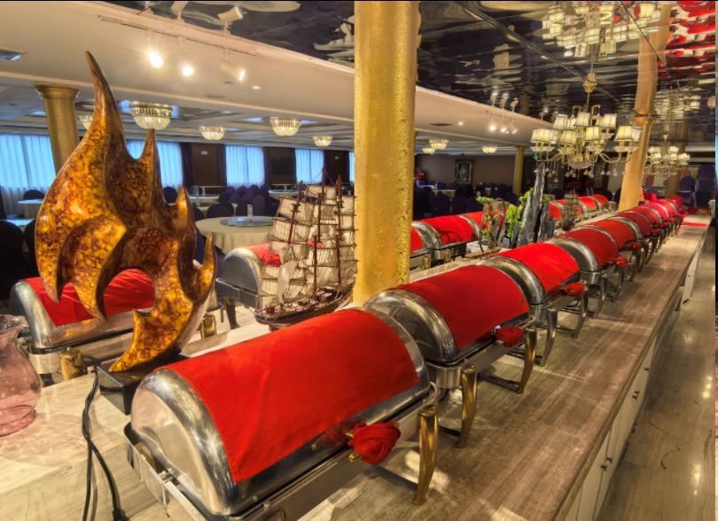 傍晚18点,黄金游轮准备了丰盛的登船晚餐,中西式菜品搭配丰富,清蒸鱼、回锅肉、时蔬沙拉等兼顾口味与营养。