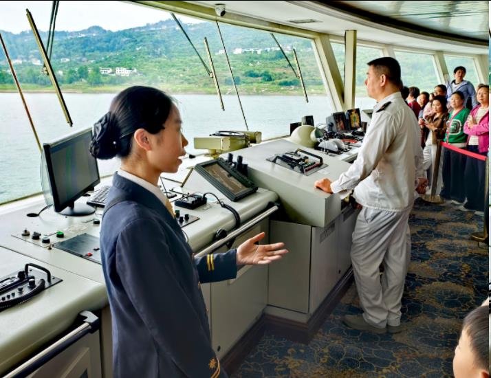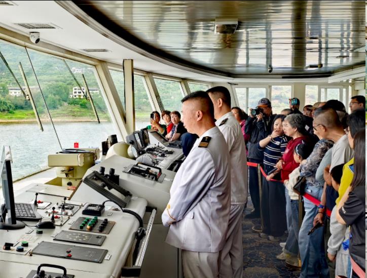 餐后稍作休息,我们在工作人员安排下参观了黄金3号游轮驾驶台。宽敞明亮的驾驶舱内,精密导航与操控设备整齐排列,船长与船员严谨专注,耐心讲解长江航道特点与航行知识。站在全船视野最好的位置眺望大江,我们对这艘“移动宫殿”的专业与安全多了一份由衷的信赖。
