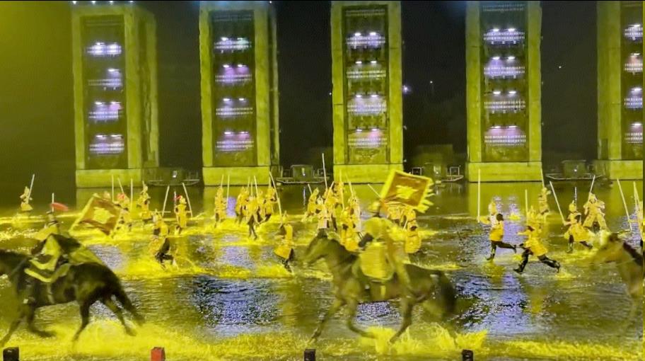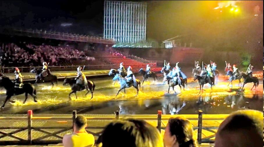 35000平方米水上舞台气势恢宏,320平方米水幕投影与3D全息技术交相辉映,300米高速威亚让演员如神兵天降。当“桃园结义”鼓点响起,刘关张豪情壮志点燃全场;“过五关斩六将”中,演员水中策马奔腾,水花四溅;“火烧赤壁”一幕火光冲天,战船水面激战,特效逼真,让人仿佛置身千年古战场。60分钟的演出,既有金戈铁马的豪迈,又有儿女情长的柔情,让我们深刻感受三国文化的厚重与忠义精神的伟大。演出结束,掌声雷动,这成为旅程中最难忘的记忆之一。