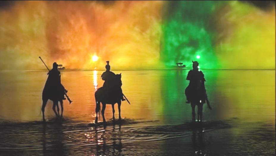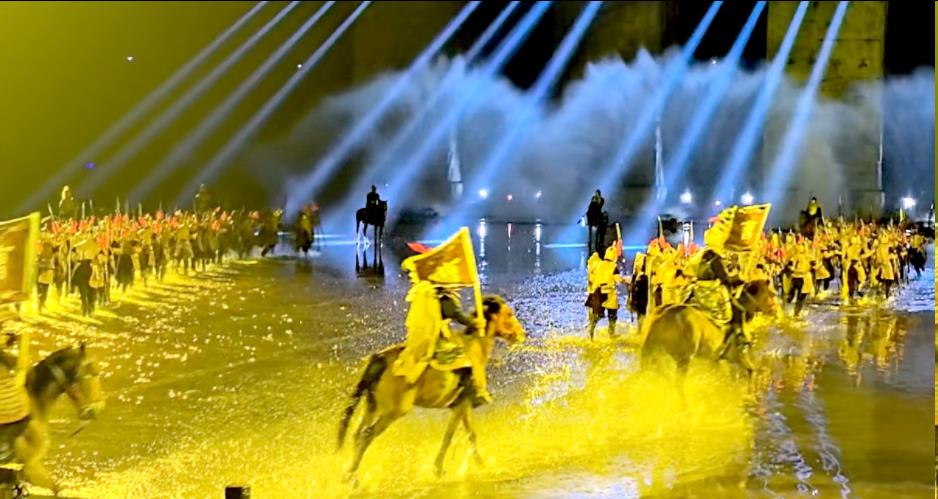 4月7日晚19点,黄金3号停靠重庆忠县码头,我们前往忠县三峡港湾旅游度假区,观看大型山水实景演出《烽烟三国》。演出以万里长江为背景、三峡港湾为舞台,以关羽忠义精神为灵魂,通过灯光、音响、威亚、水、火等多种特效,再现“桃园结义”“过五关斩六将”“火烧赤壁”等经典历史事件。