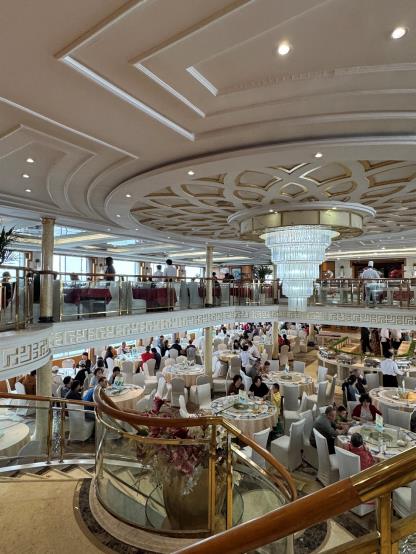 总统7号上下两层中空餐厅,上面是付费餐厅,小桌不拼桌,下面是主餐厅,虽然拼桌,但也秩序井然。船方管理不错,总统7号游客的整体素质也比我们想象的高得多。