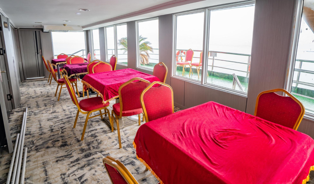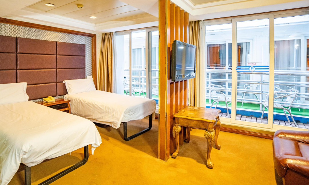 o条件比较一般的一艘小船,棋牌室比较宽敞、房间都带阳台,但不管是公共设施还是房间设施都比较简单;