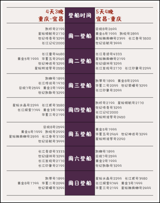 这条线上的三峡游轮,基本上都遵循重庆-宜昌4天3晚、宜昌-重庆5天4晚,且都在每周固定时间发船的规律。