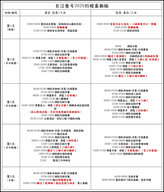 因为要保留原船过两坝(三峡大坝+葛洲坝)+游览完整长江三峡(瞿塘峡+巫峡+西陵峡)+宜昌市中心登离船(宜昌九码头)的行程体验感与便利性,长江壹号上下水都是5天时间、比其他三峡游轮平均每月少1-2个航次。
