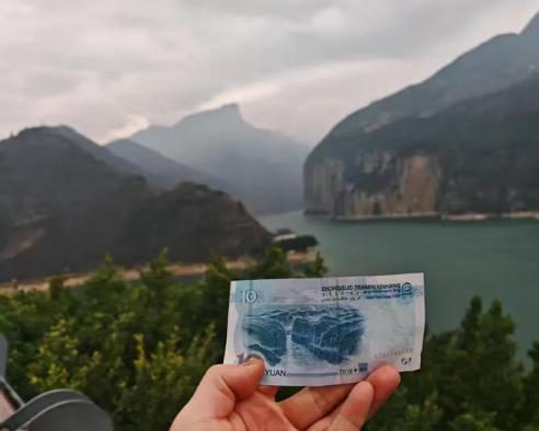 中午开始正式进入三峡。夔门,瞿塘峡,三峡第一峡,十元人民币背面的地方,拿出来打卡,确实是一样的,当然了实景会更美。